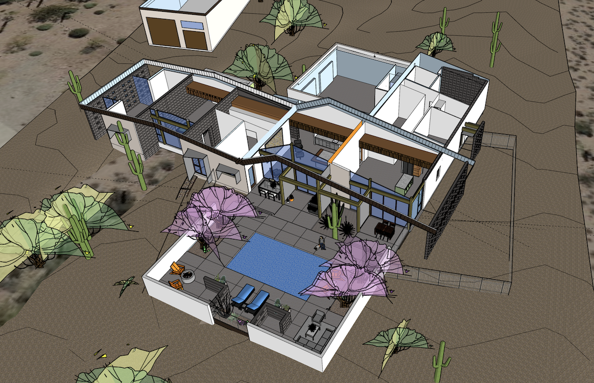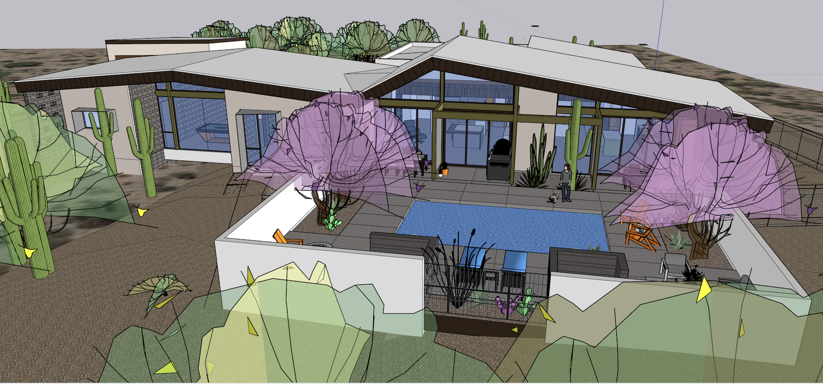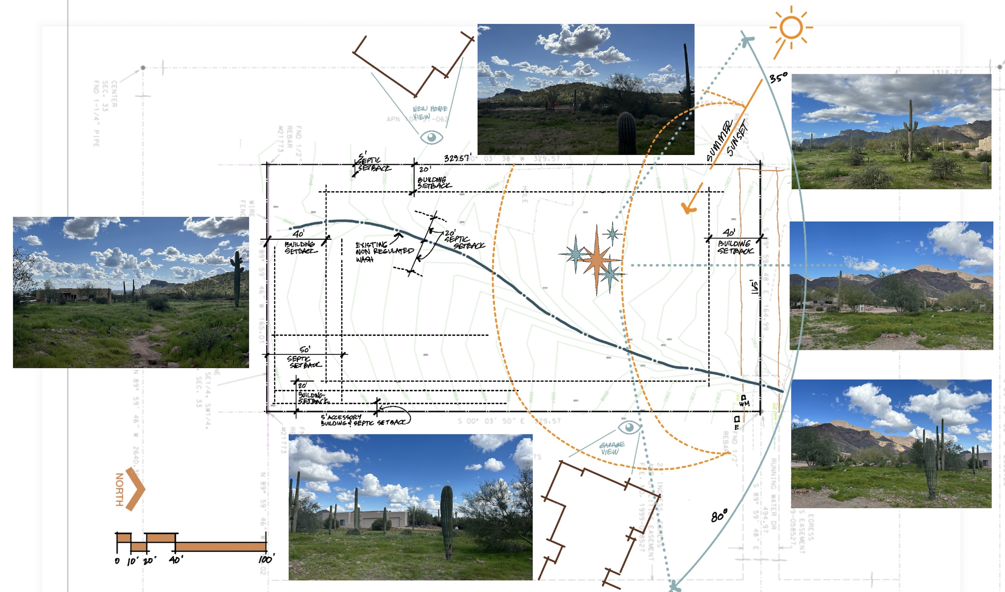 Climate and Structure.  The home will be respectfully placed on the site, nestled into the native landscape and existing wash.  It will be built with simple trusses, conventional wood-framed and masonry walls, and fully open to the north to maximize our views of the majestic Superstition Mountains.  The concern about Budget is yet to be overcome, but I believe we are on the right path.  As we move forward into floor planning, 3d form, and materiality, I will gather early pricing and then push to a full bid set.