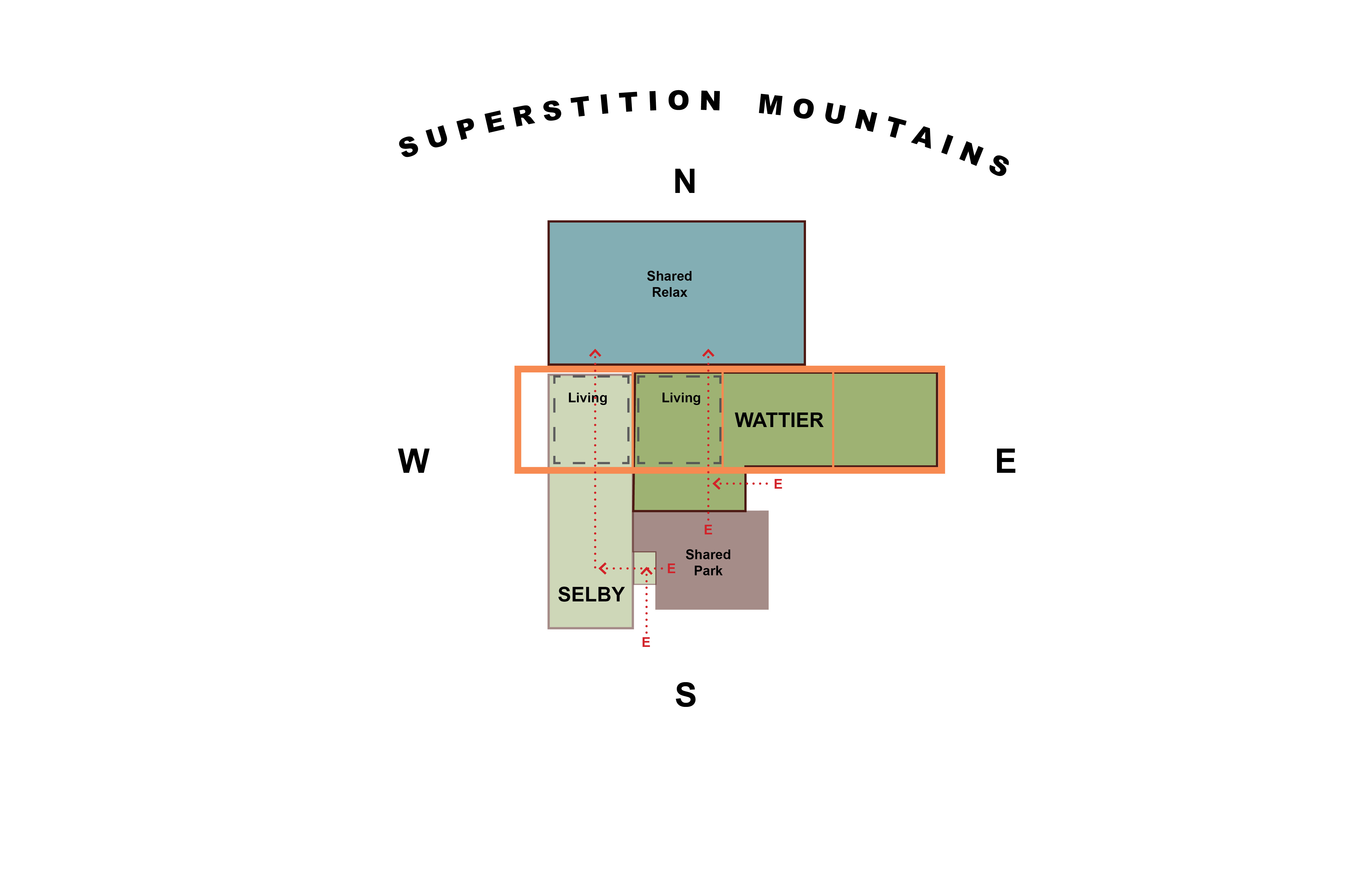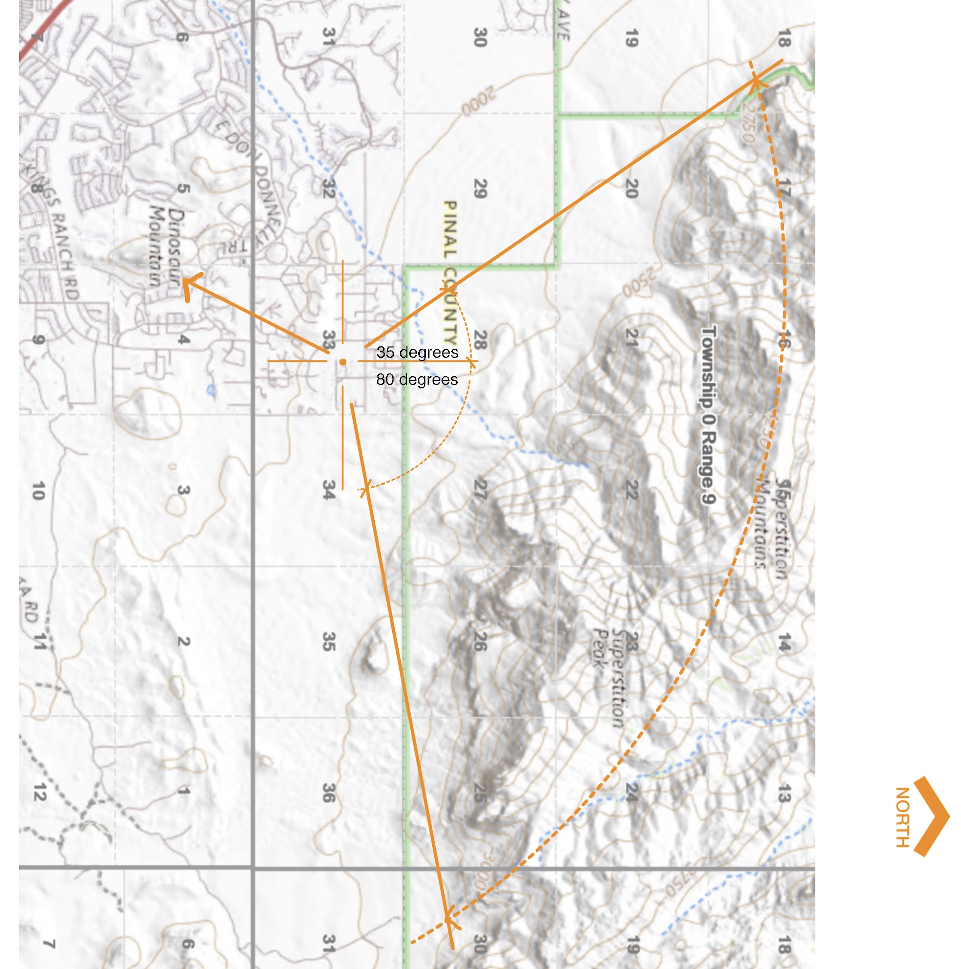 As illustrated in post #2, the Mountain View Study and Site Study were very informative.  The amazing view and accessibility of the Superstition Mountains are the most inspiring aspect of our site.  The location of the stars on the Site Study drawing suggest a desired location for the house, utilizing the existing wash location and preserving as many existing native plants as possible.  With the unparalleled views of the Superstitions to the north, the house needs to be oriented so that the maximum amount of indoor and outdoor rooms gaze upon the mountains.  The home to the east has its garages facing our property and the west property has a home closer to us than we prefer.  Both of the east west properties accentuate the need to focus our home and rooms to the north and south.   While the view to the south is very nice of Dinosaur Mountain, the south sun will have a large impact on design.  Best solar orientation practice is to design a home  more linear, utilizing short sides on the east and west and long sides on the south and north.  This orientation practice works well with our adjacent east and west neighbors.