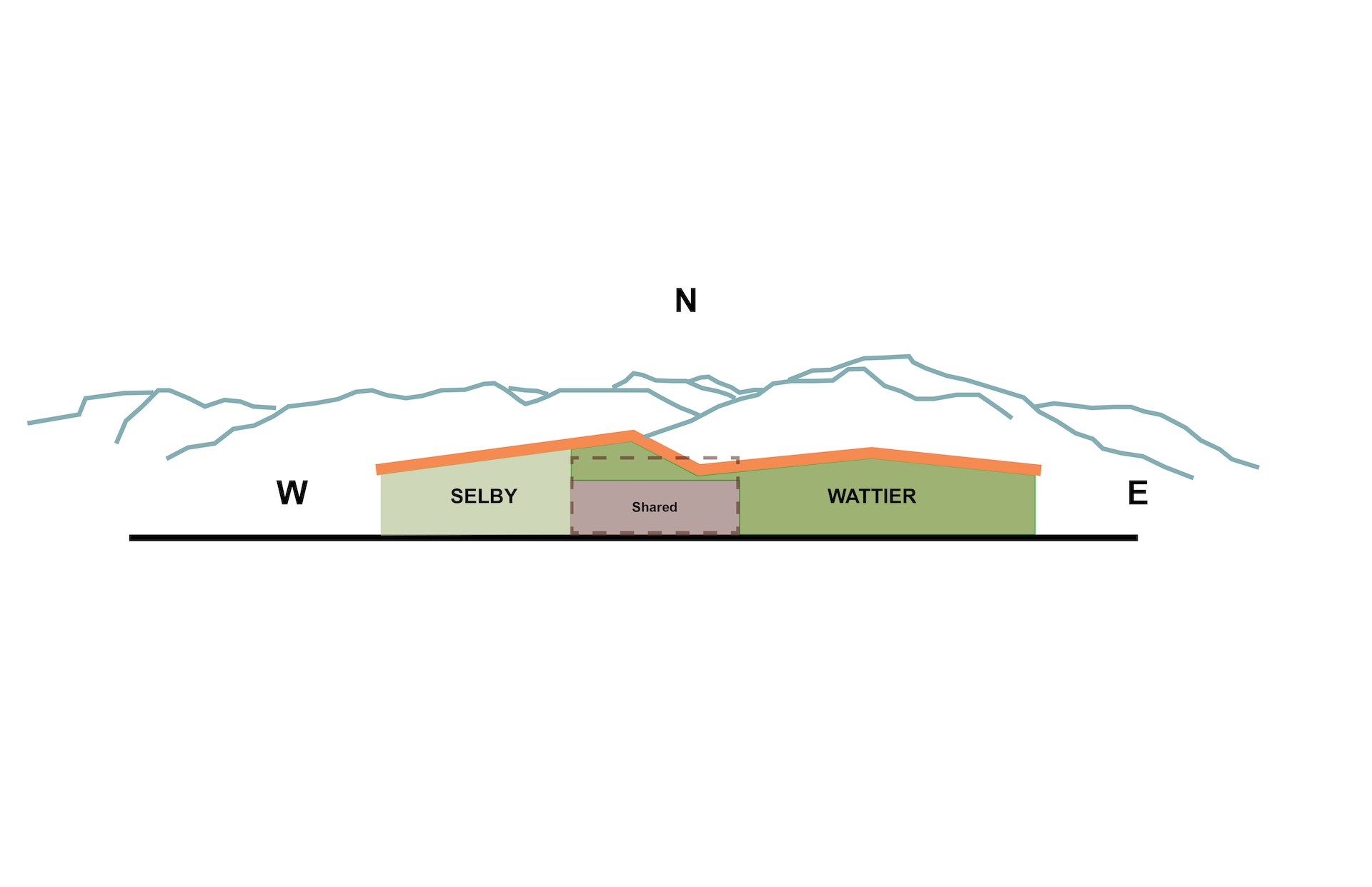 Both homes need to be physically and symbolically treated equal.  I envision the undulating sloping roof as a gathering form for both homes, punctuated with a powerful crescendo moment at both living and eating areas.  Think of an arm or body embracing and holding us all together, reminiscent of a gecko peacefully and majestically resting on a rock.  The diagrams and form also respond well to Siting, Desert Beauty, Climate and Structure.  The home will be respectfully placed on the site, nestled into the native landscape and existing wash.  It will be built with simple trusses, conventional wood-framed and masonry walls, and fully open to the north to maximize our views of the majestic Superstition Mountains.  The concern about Budget is yet to be overcome, but I believe we are on the right path.  As we move forward into floor planning, 3d form, and materiality, I will gather early pricing and then push to a full bid set.